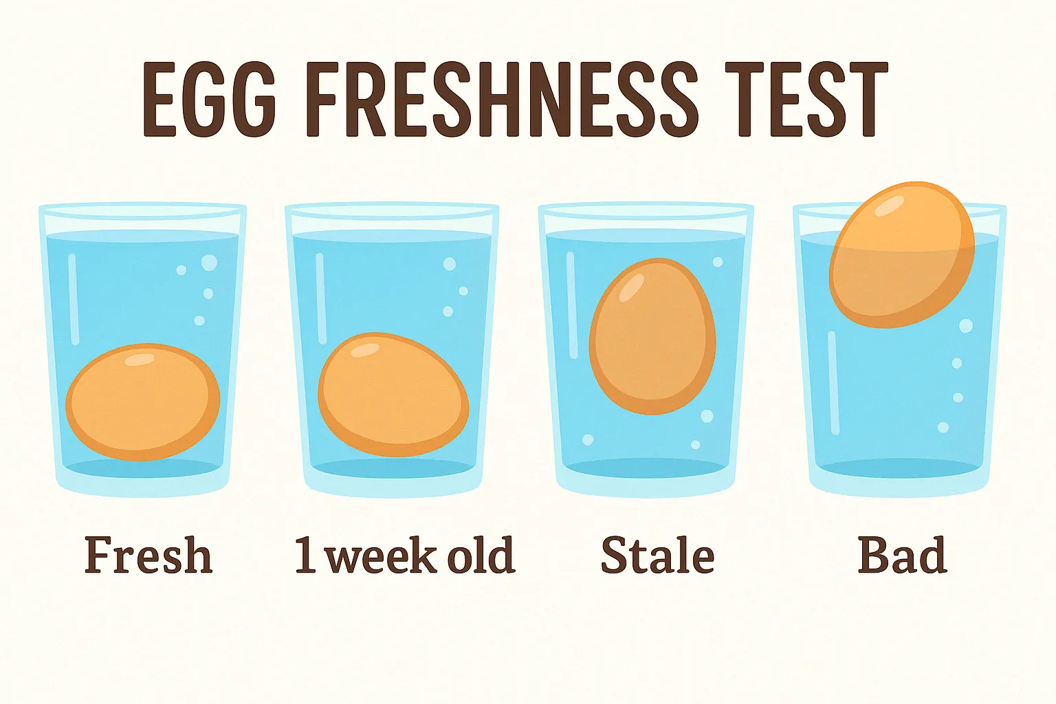 You can test your eggs for freshness by placing them in a glass of water. If the egg sinks it’s fresh and if it floats to the top you need to throw it out!