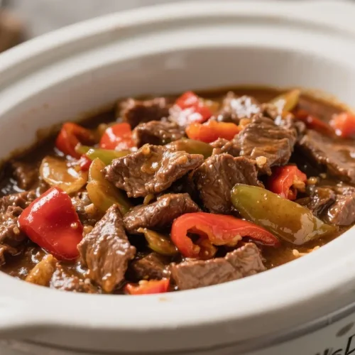 This pepper steak is all about ease without compromising flavor. A quick “dump and go” approach means no searing or pre-cooking—just straightforward prep and a hands-off cook time.
