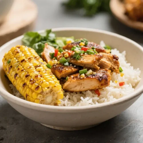- Assemble the bowls: Add warm rice to each bowl.Top with sliced chicken and a generous scoop of street corn. Drizzle with chili-lime crema.